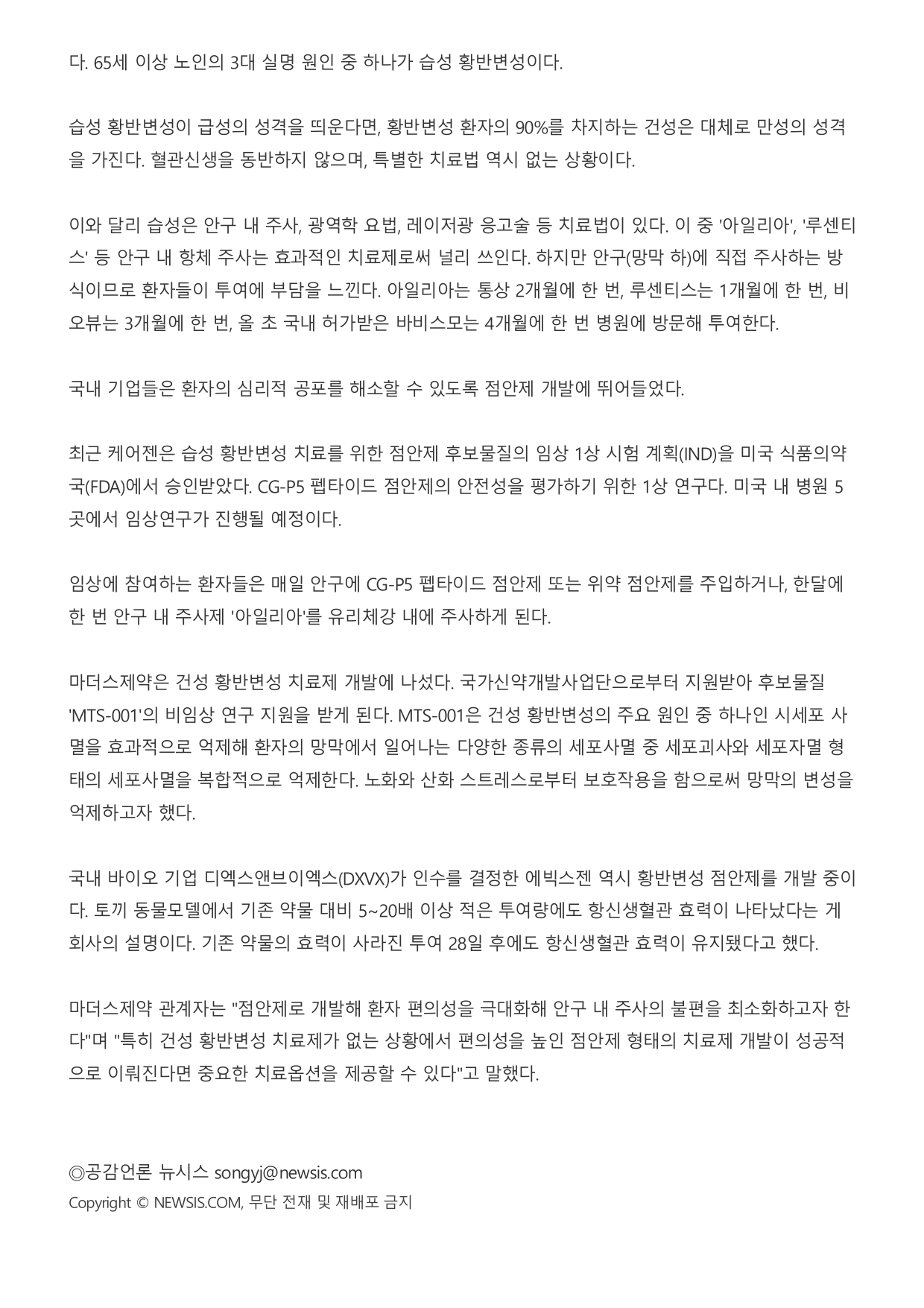 원문기사링크 : "눈에 주사를 놔? 무서워"…점안제 개발 나선 제약바이오 :: 공감언론 뉴시스통신사 :: (newsis.com)